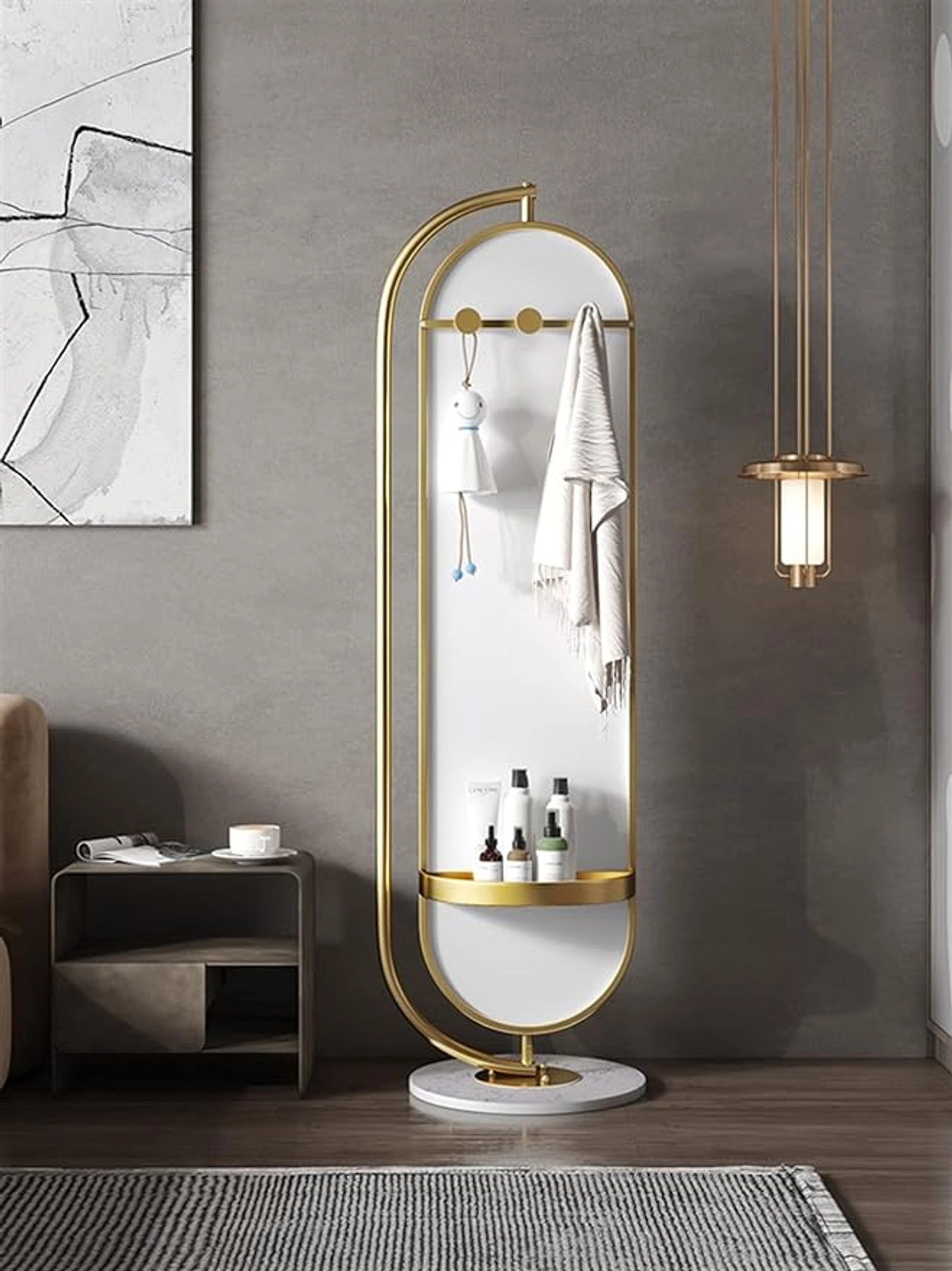 The rotating design allows you to adjust the angle effortlessly, making it perfect for daily grooming, outfit checks, or enhancing the depth and brightness of your room. The gold electroplated finish gives it a contemporary, high-end appeal that blends beautifully with modern interiors.