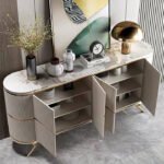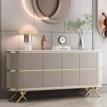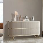 The Modern Wood Storage Console features a premium cream wooden finish paired with elegant golden stainless-steel legs, giving it a luxurious modern look suitable for any living room, hallway, or dining space. The soft cream tone blends effortlessly with all interior styles while adding a warm and sophisticated aesthetic.